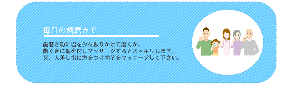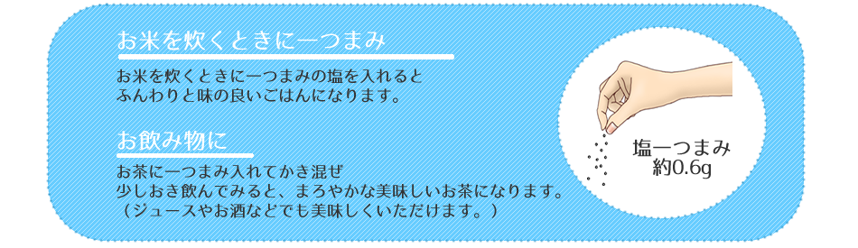 私達の体は個人差や季節や運動量によって必要な塩分がいつも変化しています。塩気のあるものを食べたり飲んだりした時に「アッからいな」と感じたら、体がもうこれ以上塩分は欲しくないよとサインをだしています。よく塩辛いものを食べた後で水分が欲しくなるのは、人間の体が血液中の塩分濃度を一定に保つ働きを持っているからです。このとき水分と、ミネラルの一種でリンゴやバナナ等の果物や野菜に多く含まれるカリウムが、体内の余分な塩分を体外に排出してくれます。塩分過多ははよくありませんが、体の代謝機能に不可欠な塩分の不足もまたよくありません。カリウムを多く含む果物や野菜等とともにバランスの良い塩のとり方を心掛けましょう。